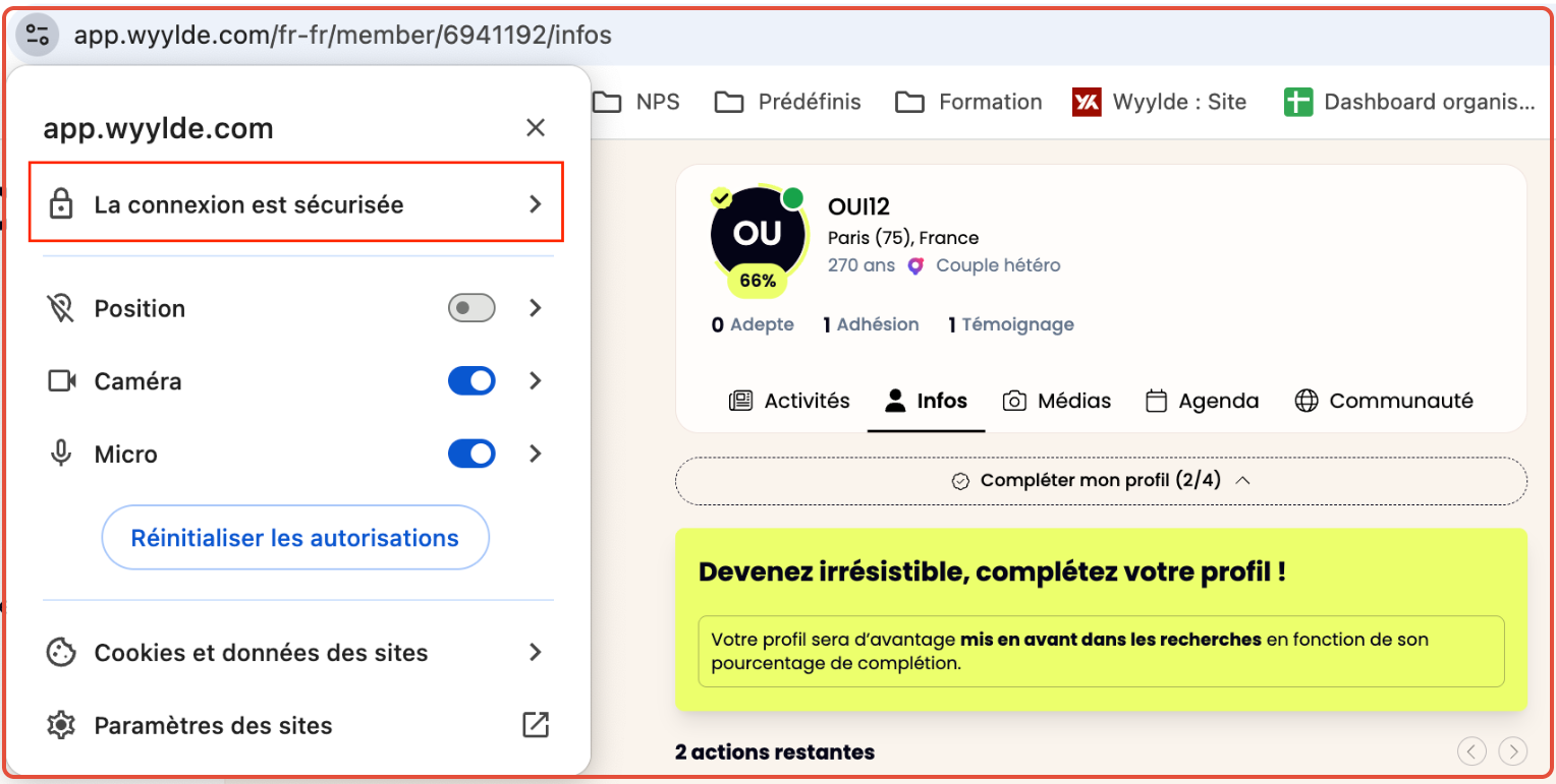 La connexion à wyylde.com utilise une version de protocole https et une suite de chiffrement sécuris signalé par le cadenas précédent l'URL wyylde.com dans vos navigateurs.
