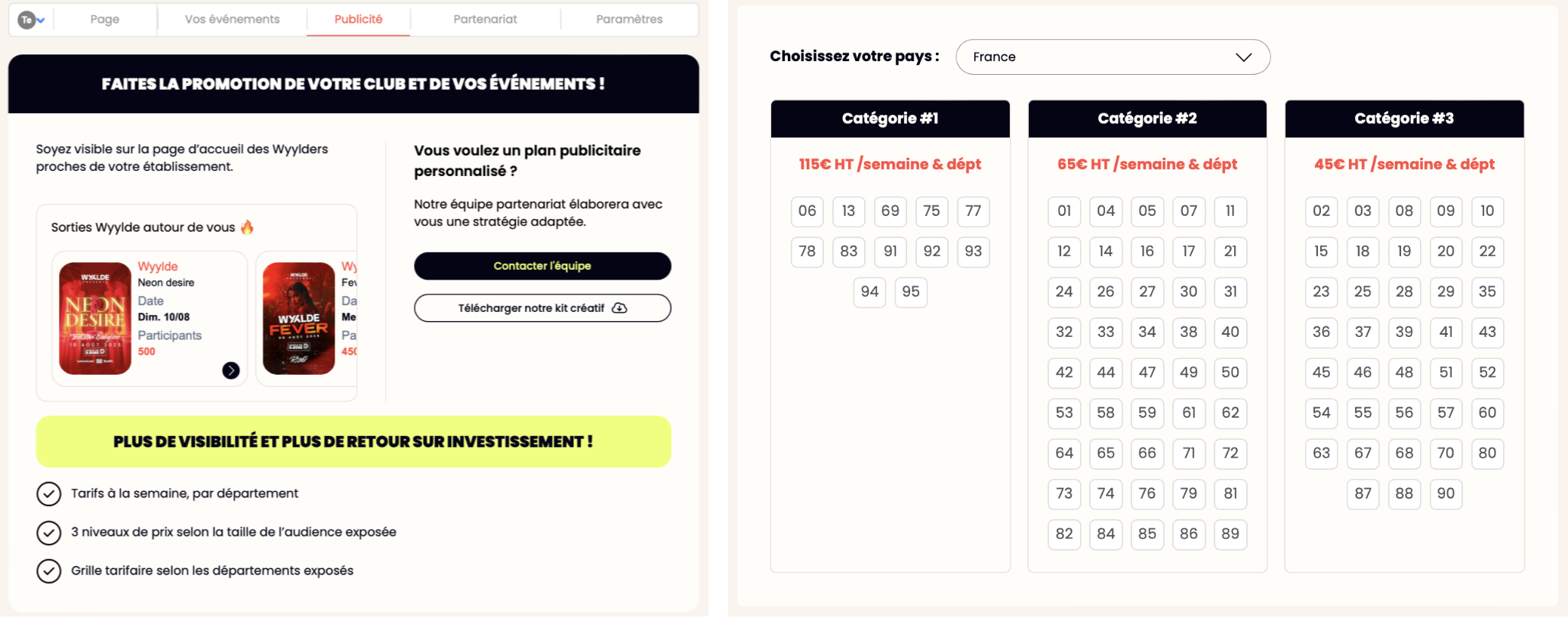 Lorsque vous souhaitez promouvoir une page ou un événement, vous avez la possibilité d'afficher le flyer de vos soirées ou de mettre votre page en avant sur la page d'accueil de Wyylde.