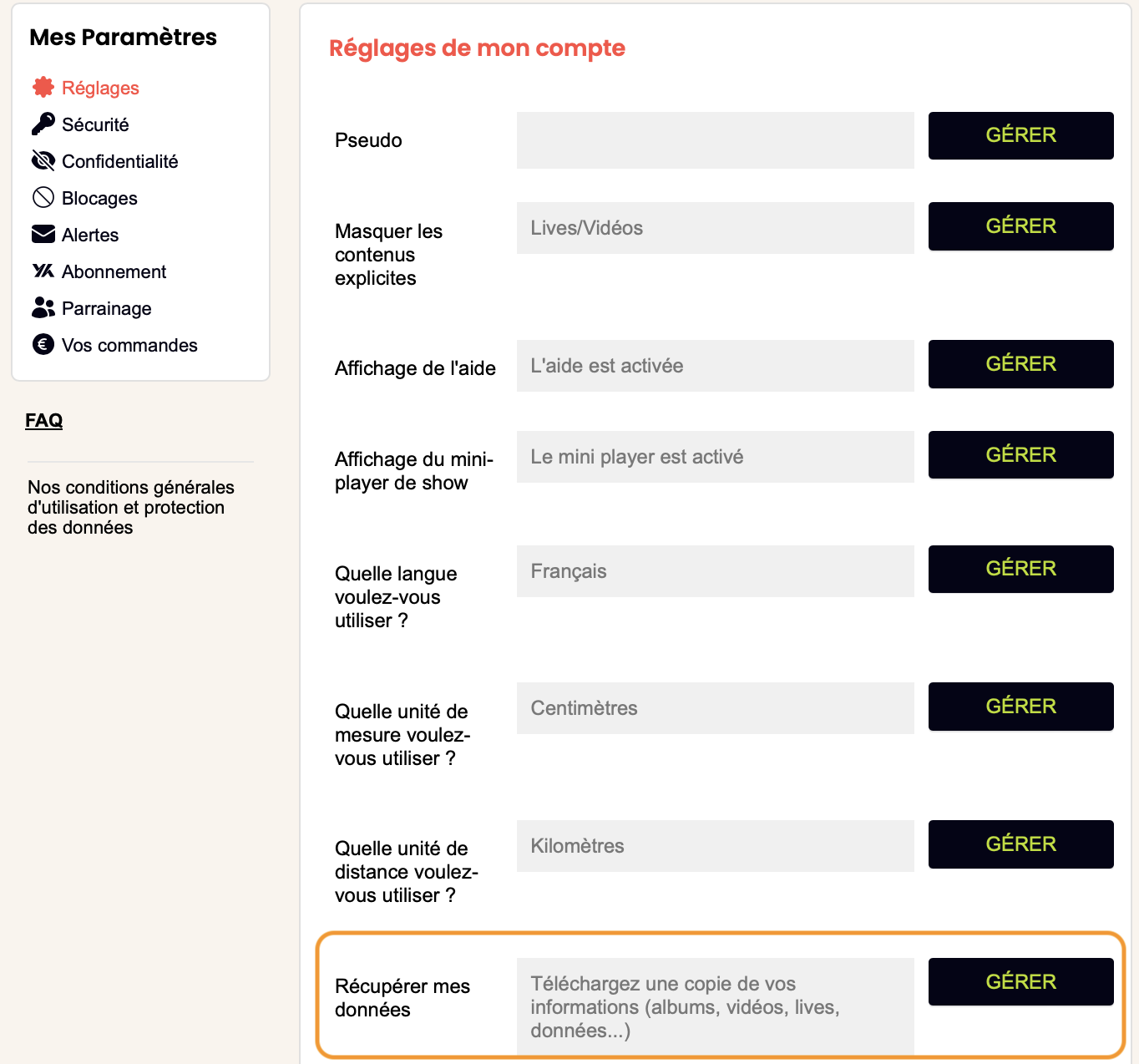 Vous avez la possibilité de demander une récupération des données que contient votre compte. Pour cela, vous devez vous rendre dans vos Paramètres, puis dans la partie Réglages.